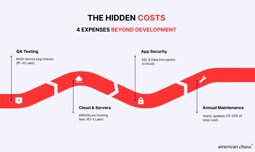 The big ones: QA testing (₹1-10 lakh), which you absolutely cannot skip; security and compliance, especially for fintech or healthcare (add 20-30%); and ongoing maintenance (budget 15-20% of initial cost annually). Also factor in app store fees, hosting costs, and the inevitable “oh, we need to change this” moments that pop up during development. Build a 15-20% contingency buffer into your budget. You’ll use it.